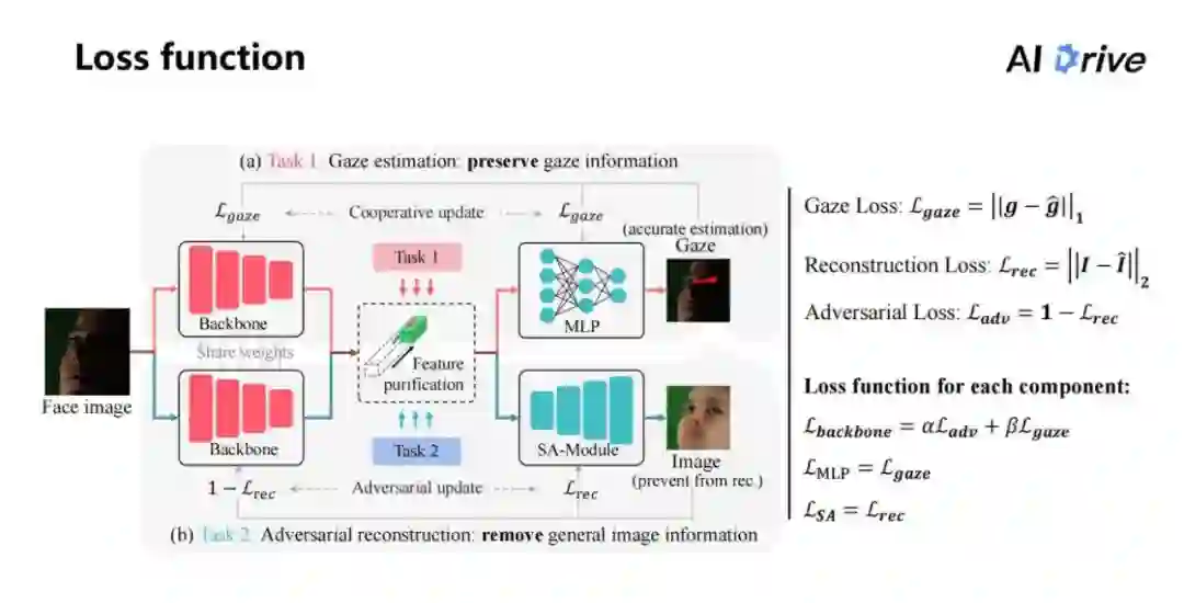 对于 Backbone 和 MLP 来说,我们要求它是尽可能精准地估计视线方向,也是使用任务一保留视线信息。同时对于任务二,要去移除所有的图片信息。怎么让特征移除掉所有的图片信息,在这里做了一个假设。