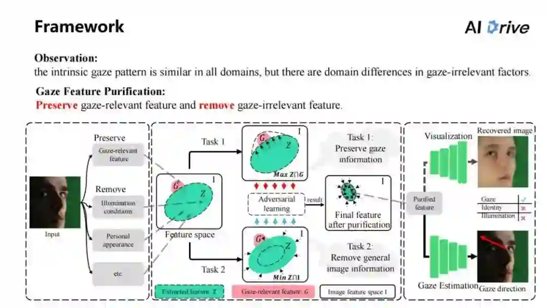 所以,本文的主要想法就是视线特征的纯化。这需要把跟视线相关的特征保留下来,同时把无关的特征去除,这样得到的视线相关特征是比较好实现的,能够在每个域上面都得到使用。