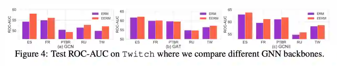 对于Twitch数据集,我们使用子图DE作为训练集,ENGB作为验证集,其余作为测试集。由于是二分类问题且类别标签不均衡,所以我们使用ROC-AUC作为评测指标。下图显示了分别使用GCN、GAT、GCNII作为网络主干,ERM与EERM在5个测试图上的性能对比。可以看到,EERM在几乎所有情况下都超越了ERM。