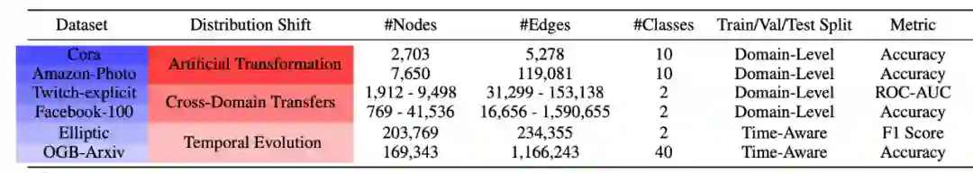为了验证提出的方法,我们需要设计实验,测试模型在不同数据分布上的性能。真实的图数据中可能包含多种不同的分布偏移,这里我们考虑三种情况:人造混淆噪声(Artificial Transformation)、跨图领域迁移(Cross-Domain Transfer)、动态图时序泛化(Temporal Evolution)。下表展示了本文使用的6个数据集以及对应的分布偏移的形式。