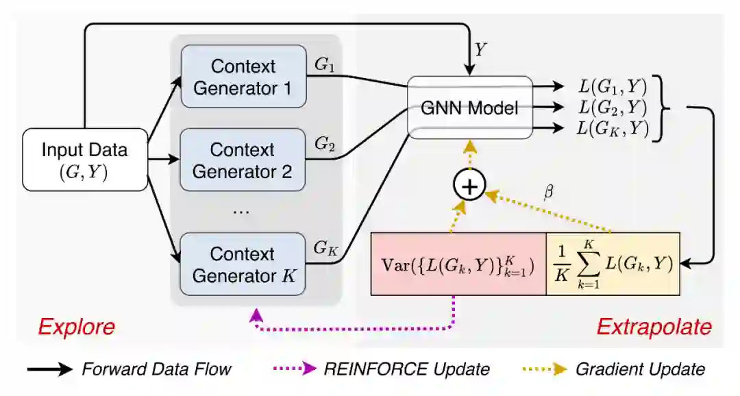 具体的,我们将每一个改变视为动作(action),最终使用基于策略梯度的REINFORCE算法进行优化,以解决离散动作空间采样不可导的问题。我们将本文提出的方法称为Explore-to-Extrapolation Risk Minimization(EERM),下图给出了训练过程的数据流图。