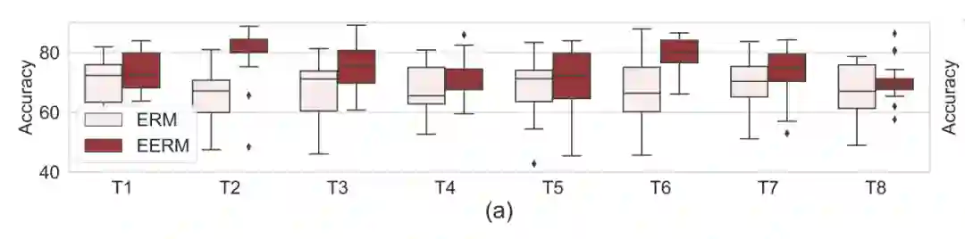 我们考虑使用GCN作为预测模型主干,下图分别显示了使用传统方法(Empirical Risk Minimization,ERM,即直接优化训练数据的损失)与本文提出方法(EERM)在Cora和Amazon数据集上8个测试图的准确率(Accuracy)对比。这里,我们重复了20次实验(使用不同网络初始化),展示了准确率的分布情况。可以看到,EERM在绝大多数情况下明显好于ERM。