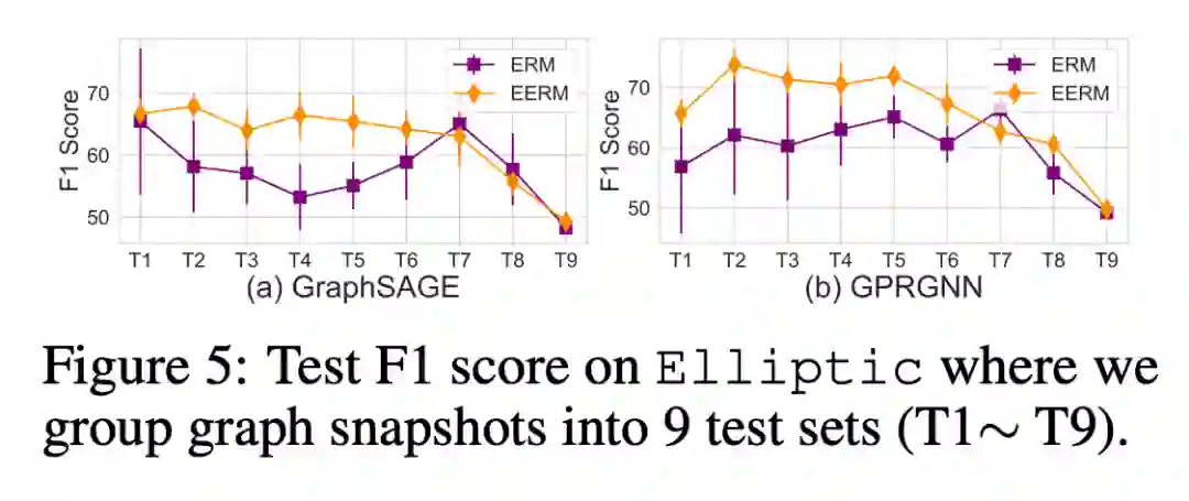 我们使用F1分数作为评测指标,下图显示了使用GraphSAGE和GPRGNN作为主干模型的效果对比。可以看到,EERM显著好于ERM,取得了平均9.6%/10.0%的提升。