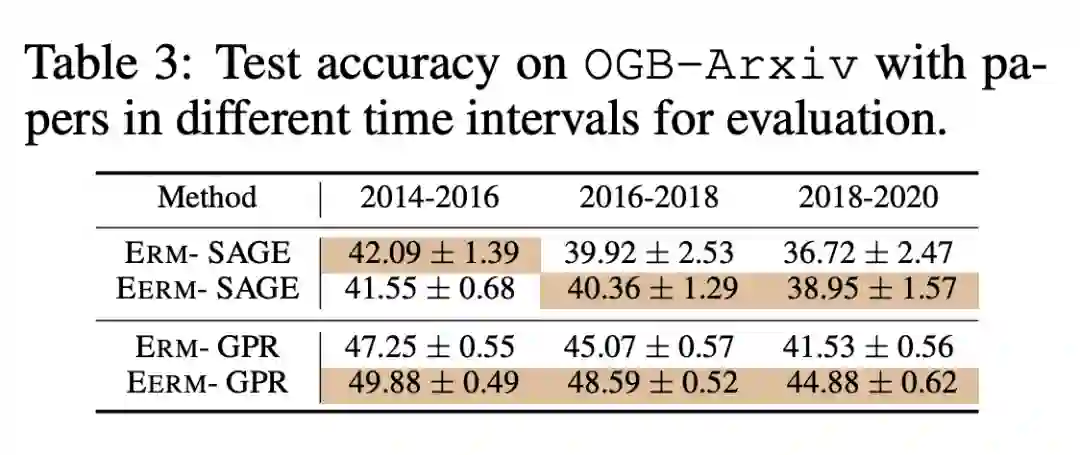 接着我们考虑第二种情况,随着时间的推移,图中的节点和连边会发生变化。这里我们考虑OGBN-Arxiv数据集,其中每个节点是论文。我们按论文的发表时间将节点分为训练集和测试集。为了引入分布偏移,我们扩大训练节点和测试节点的时间间隔:使用2011前发表的论文作为训练集,2011-2014年发表的论文作为验证集,2014年之后的为测试集。下表展示了时间在2014-2016/2016-2018/2018-2020年的测试节点上的测试准确率。可以看到,随着时间的推移(分布偏移进一步扩大),模型的性能都呈现下降趋势,但ERM的下降趋势更为明显。这也说明,EERM能够有效提升模型对分布偏移的鲁棒性。