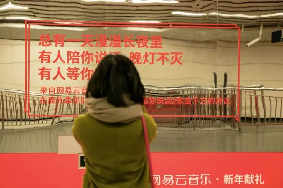 新年极具视觉冲击力的镜面长廊呈现的 14 组走心乐评以及 3 月上线的乐评笔记书《听什么歌都在像唱自己》都将扎心力爆棚的线上内容落地到线下,以镜子、书籍为载体使歌曲故事化,传递音乐的力量,直击用户痛点,让用户通过乐评来交流音乐、感受音乐。