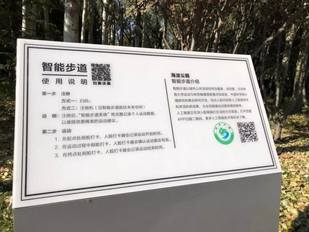 智能步道起点、中间点、终点三处设有人脸识别杆,公众在步道内运动,即可通过百度人脸识别技术记录运动数据。▼