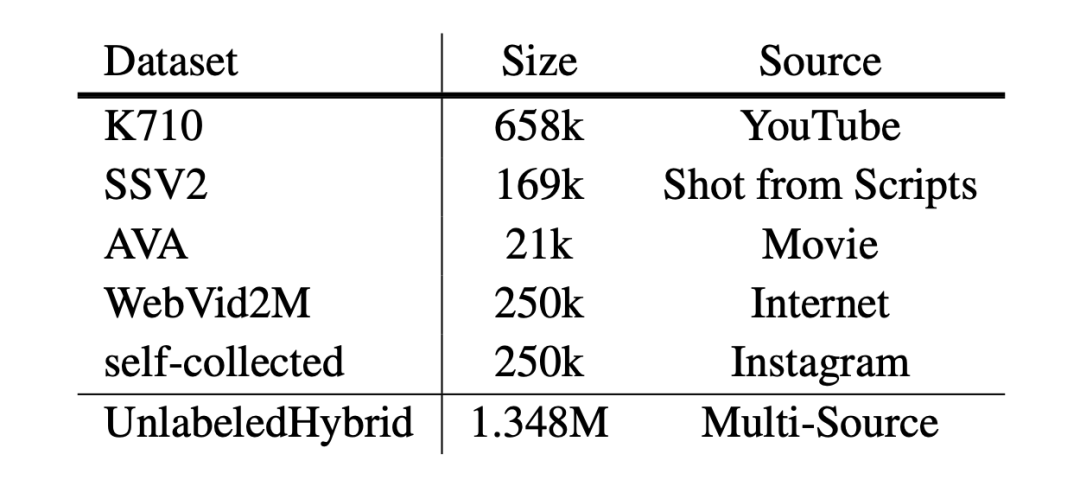 VideoMAE V2 旨在训练出一个更加通用的视频基础模型,能够泛化到不同的下游任务中。为了让模型更好地学到通用表征,我们增加了预训练视频数据的规模和多样性。具体来说,我们混合网络、YouTube、Instagram、电影、人工拍摄等不同来源的视频数据,构建出了一个包含 135 万视频片段的无标签多源数据集。值得说明的是,这是首次在如此大规模且多样化的视频数据集上对 video transformer 模型进行预训练。数据集的具体构成如下,更多细节可参考论文。
