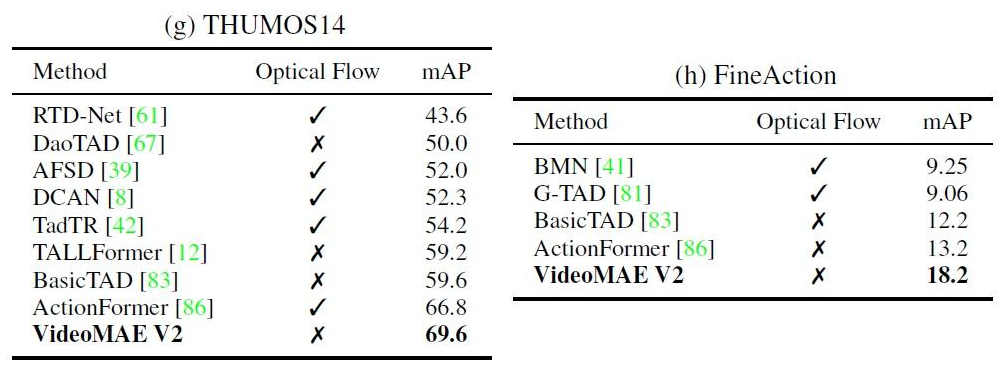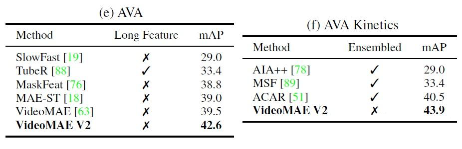 VideoMAE V2-g 在 AVA,AVA-Kinetics 等数据集上测试时空动作检测性能。我们采用双阶段方案,人物框由人检测器单独给出,训练时采用真实框,测试时采用由 AIA 检测的人物框,具体流程与原始 VideoMAE 一致。