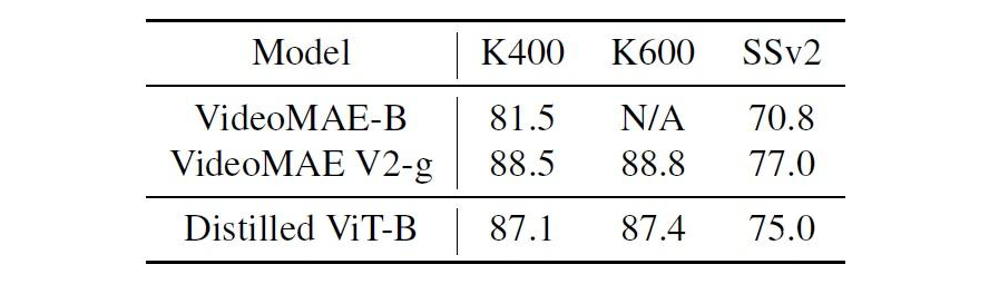 我们将 VideoMAE V2-g 蒸馏到 ViT-B 模型中,如上表所示,蒸馏后的学生模型表现出优异的性能。具体来说,我们用 VideoMAE V2-B 初始化学生 ViT-B 模型的参数,以 VideoMAE V2-g 作为教师模型(此处的 VideoMAE V2 模型都是后预训练微调阶段后的模型);接着在混合带标签数据集 K710 上进行 100 轮次的蒸馏实验,最小化教师模型和学生模型输出 logits 的 KL 散度。