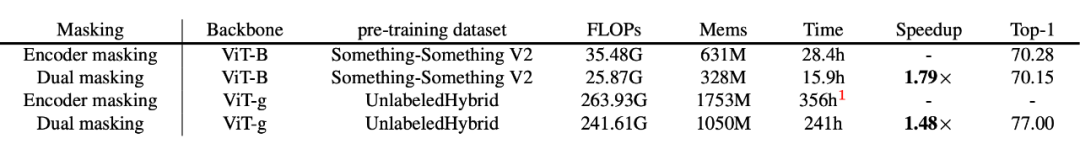 ▲ 双重掩码和单编码器掩码的对比。1 根据若干 epoch 的训练时长估计的总训练时长