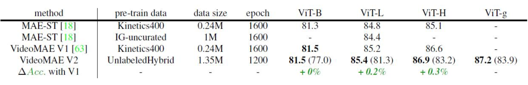 此外,与 MAE-ST 在百万级的 IG-uncurated 上预训练的 ViT-L 模型相比,VideoMAE V2-L 在 K400 上的性能高出 1%。这表明,训练数据的质量和多样性可能是影响模型性能的另一个重要因素。