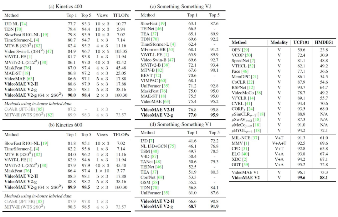VideoMAE V2 在 Kinetics-400/600, Something-Something V1/V2, UCF101, HMDB51 等数据集上测试动作识别性能。