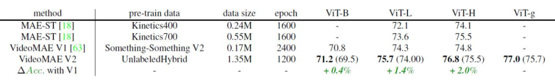 采用 ViT-H 作为骨干网络,VideoMAE V2 模型在中间微调后的性能比 MAE-ST 高 1.8%。这一性能优势可能归功于更大的无监督预训练数据集和更大的中间微调数据集。尽管我们也在 SSv2 上进行了后预训练微调的实验,但结果表明这会导致微调精度下降。