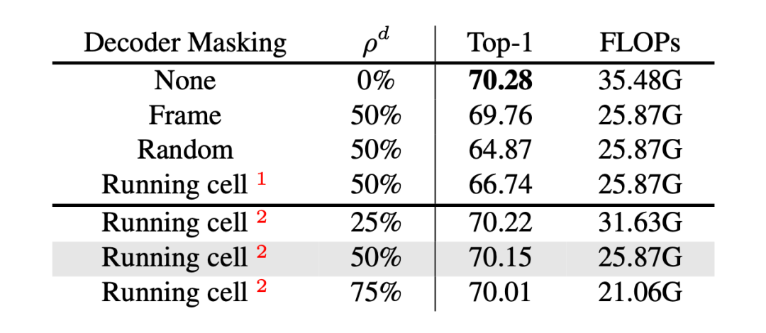 为保持 VideoMAE 的预训练性能,我们需要为解码器掩码图选择恰当的掩码策略。编码器选择高掩码率的管道掩码策略,从而缓解时序相关性导致的“信息泄露”问题。与之相反,在解码器掩码策略中,我们需要鼓励“信息互补”,即选择尽可能多样化的立方块重建,以减少该过程中的监督信号损失。我们比较了不同的掩码策略,最终选择运动单元掩码策略(running cell masking)。更多细节参照实验部分。
