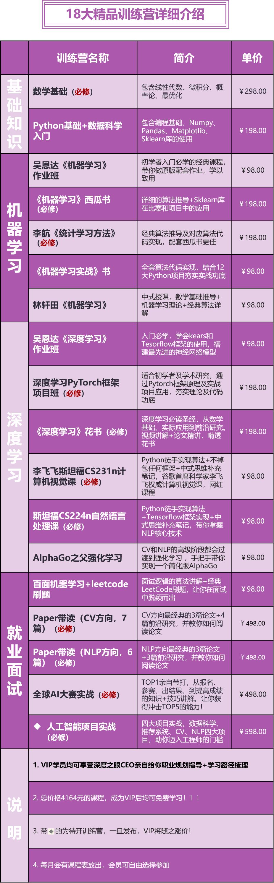 一本花书,500多页,全部啃下来非常的难,因此我们进行了重新的梳理,并进行了顺序重组,精心安排了每天详细的教学计划和任务,对2个月进行整体规划,每日任务布置+打卡监督+每阶段作业批改点评讲解