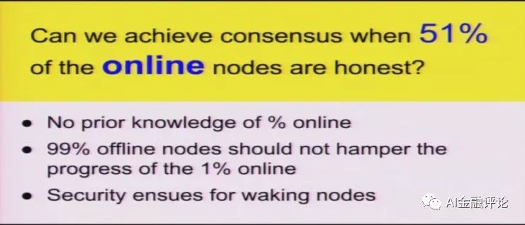 那么,为什么非同步协议也会失效呢?原因在于在非同步协议中,睡眠节点将会被视为作恶节点。假设某个协议可以在已知数量情况下允许1/3作恶者存在,但如果有99%节点为沉睡节点,那么这些节点被视为作恶节点,这样你无法得到足够选票达成共识。