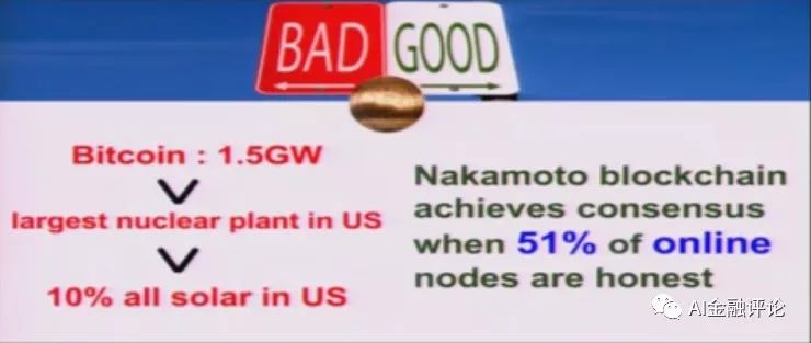 我们说比特币的中本聪区块链(PoW模式)具有鲁棒性,这有两方面含义:好处是,中本聪区块链在大多数在线节点诚实时可以达成共识;但缺点是:能耗太高。今日用于比特币挖矿的电力高达1.5GW,比美国最大的核电站发电量或者美国10%的太阳能发电量都要大。