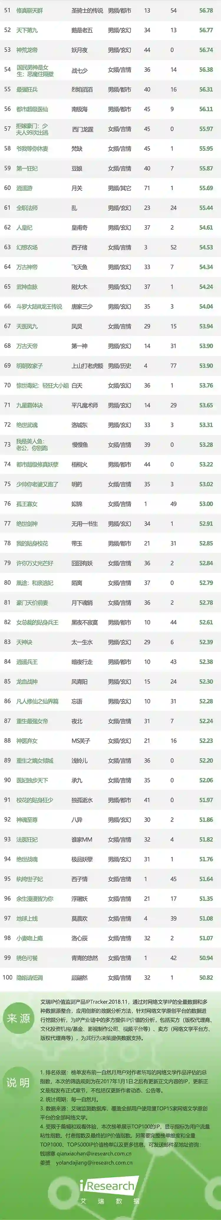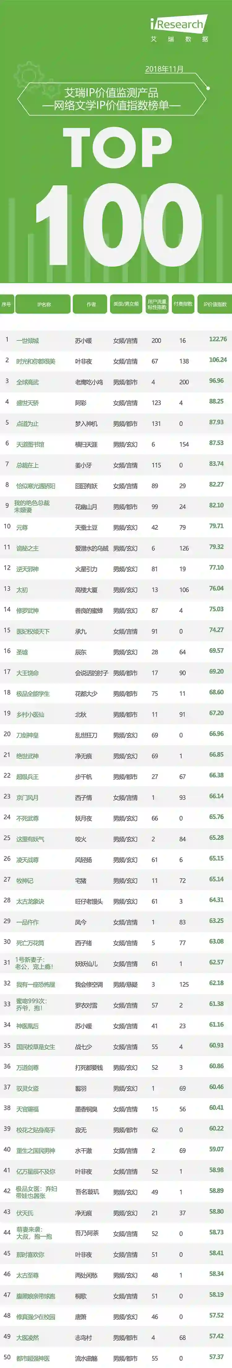 艾瑞IP价值监测产品IPTracker-11月榜单TOP100