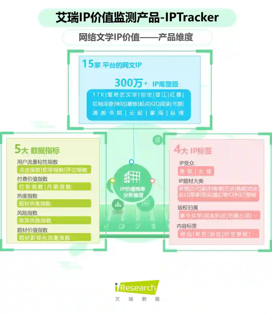 由此,为了对IP产业有更深入的挖掘和洞察,艾瑞推出艾瑞IP价值监测产品IPTracker,依托于市场监测数据库和专家访谈,应用创新数据分析方法,针对不同类型的IP进行价值监测,IP类型包括网络文学、文学出版物、漫画/动画/动漫IP。目前已完成针对中国用户使用量TOP15的网络文学原创平台,筛选出更新时间在2017年1月1日之后的IP,组建300万+量级的IP库作为研究对象的集合,进行数据挖掘和分析。未来,艾瑞IP价值监测产品IPTracker将设计不同的价值模型和评估维度,针对动漫IP推出价值监测。