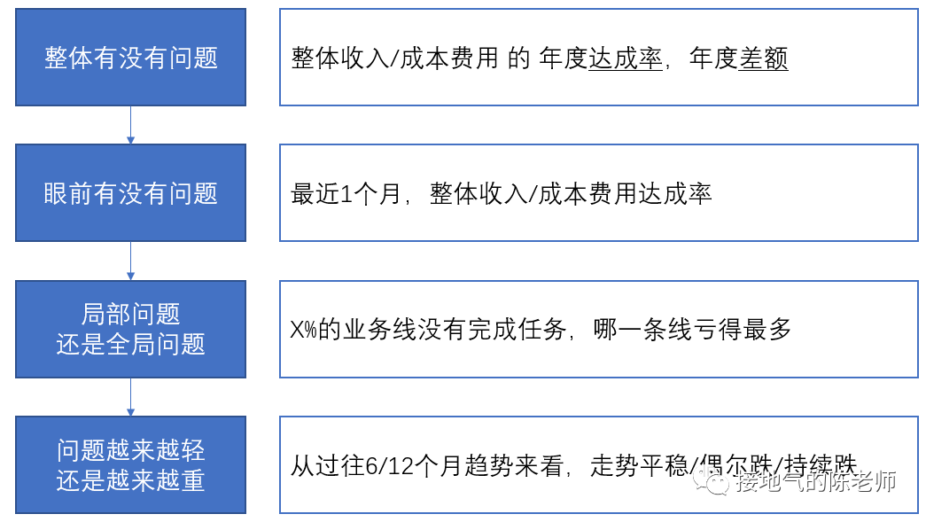 整体进度是所有经营分析报告都会重点讲的内容。但是常规的报告,经常是不分青红皂白罗列一大堆同比环比,让阅读者看得非常累。进度报告,遵循“从大到小,由近及远”的原则,一步步讲: