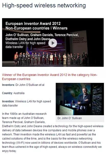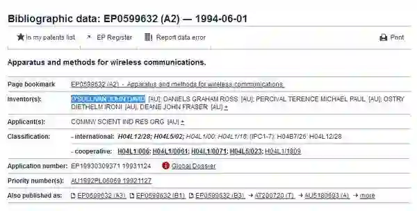 CSIRO拥有的“Apparatus and methods for wirelesscommunications”专利(图片来自网络)