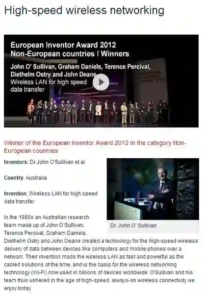 简单地将奥沙利文等人作为WiFi的发明人似乎不十分合适,因为WiFi涉及的技术面很广,其中还含有不少专利,但奥沙利文等人的确对WiFi技术的发展做出了重要贡献。