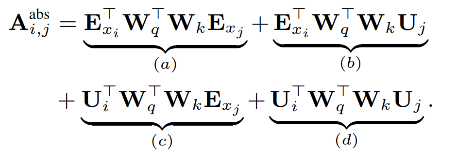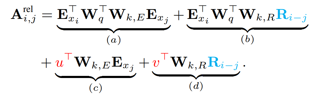对于包含在查询的位置中的项(c 和 d),我们使用两个新的可学习参数 u 和 v 替代了