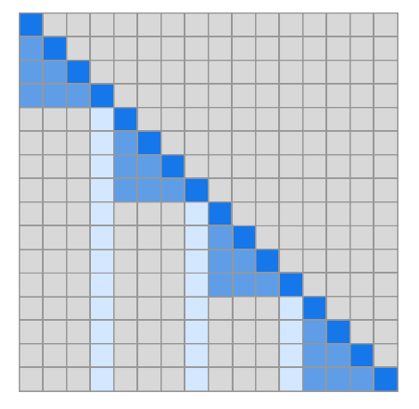 图 1:以一种自回归的形式组织的传统自注意力机制的连接模式。深蓝色方块代表「查询」向量,而浅蓝色方块代表「键」向量。