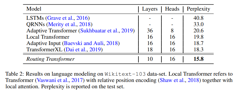 路由Transformer 在计算效率方面取得了提升,从而使模型在 Wikitext-103 上(一种单词级别的语言建模对比基准)取得了在困惑度指标上性能的提升,他们的性能大大超过了上文介绍的 Tranformer-XL 模型。