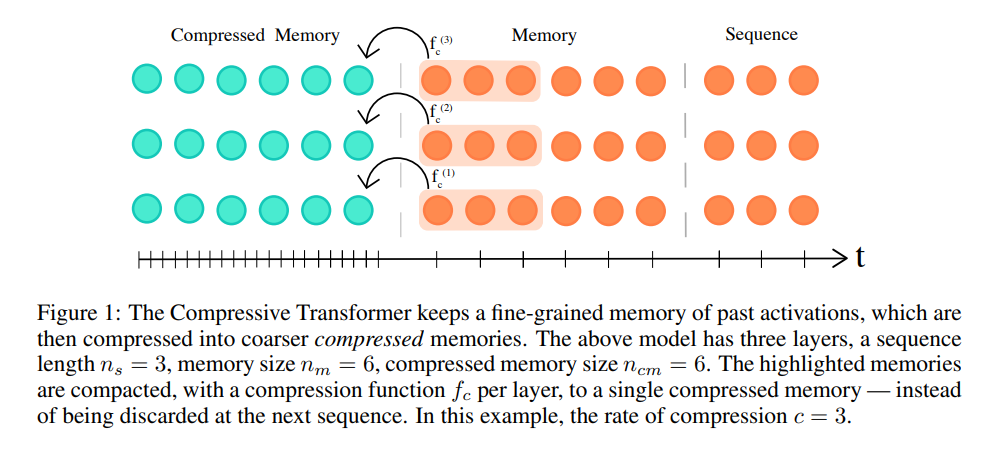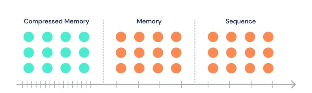 在每一个时间步上,最早的一个压缩内存会被丢弃,压缩内存的索引会回退一位。接着,常规的内存段中最早的 n 个状态会被压缩,并且被转移到压缩内存中新开的槽中。