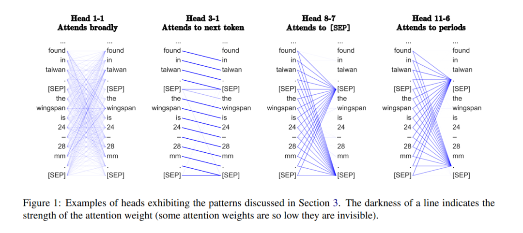 图 3:BERT 学到的注意力模式示意图,线的深度表明了注意力权重的强度(其中有一些注意力权重太小,以至于线变成了透明的)