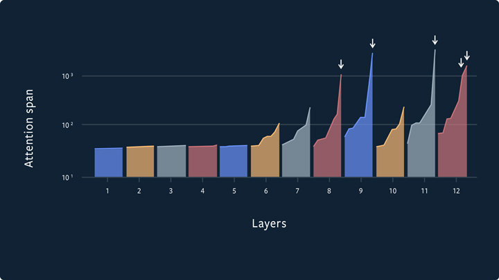 值得注意的是,尽管密集注意力机制让每个注意力头可以关注整个上下文,但很多注意力头只考虑局部上下文,而其它注意力头则考虑了整个可用序列。他们建议通过使用一种自注意力的变体来利用这种观察结果,这种变体允许模型选择它的上下文大小。