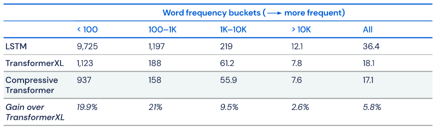 在实验中,他们设置压缩内存的大小为 512,正规内存的大小为 512,滑动窗口大小为 512,压缩率为 2(这意味着最早的 2 个内存状态会在压缩步骤中被压缩到单个状态中)。在这样的实验环境下,他们取得了目前最好的实验结果——在 WikiText-103 数据集上取得了 17.1 的困惑度。