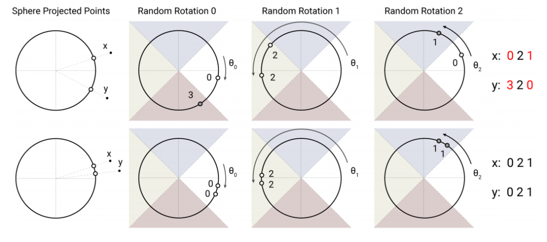 图12:角度局部敏感哈希算法示意图。图中显示了三轮哈希,每轮哈希中将空间分成了 4 个桶。在下面一排示意图的三轮哈希中中,向量都被映射到了同一个桶中,因为它们在输入中也相近;而在上面一排的第一次哈希和第三次哈希中,向量映射到了不同的桶中。