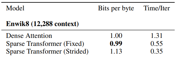 值得注意的是,分解后的注意力结构似乎不会对语言建模的性能产生负面影响,反而惊人地令每个字符需要的比特数比密集的注意力机制(原始 Transformer)在 Enwiki8 语料环境下要少一些,并且可以在包含多达 12,228 个词例的上下文中得到高效的注意力。
