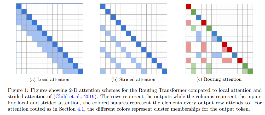 图 13:这里的图形显示了路由 Transformer 与局部注意力机制和 Child 等人于 2019 年提出的跨步注意力机制的对比结果。每一行代表输出,每一列代表输入。对于局部注意力机制和跨步注意力机制来说,着色的方块代表每一个输出行注意到的元素。对于路由注意力机制来说,不同的颜色代表输出词例的聚类中的成员。