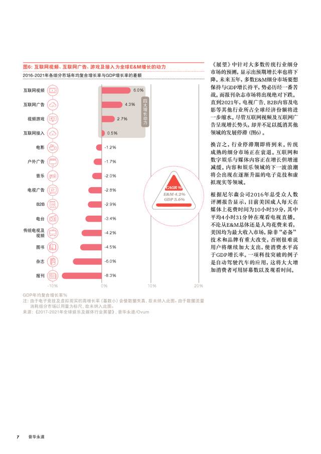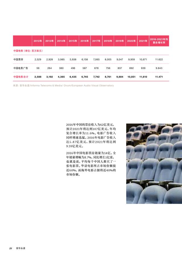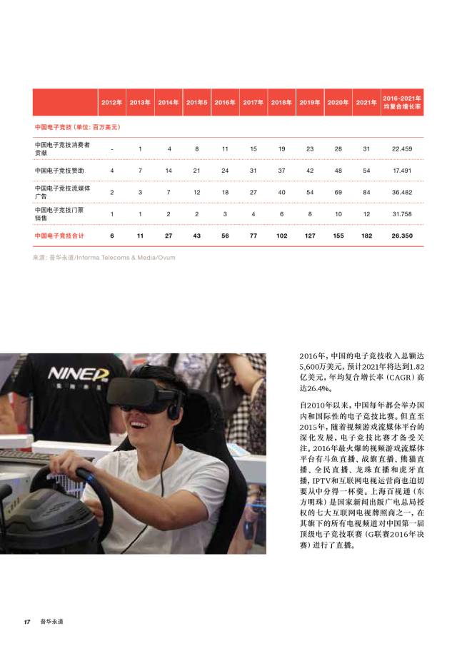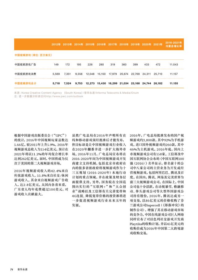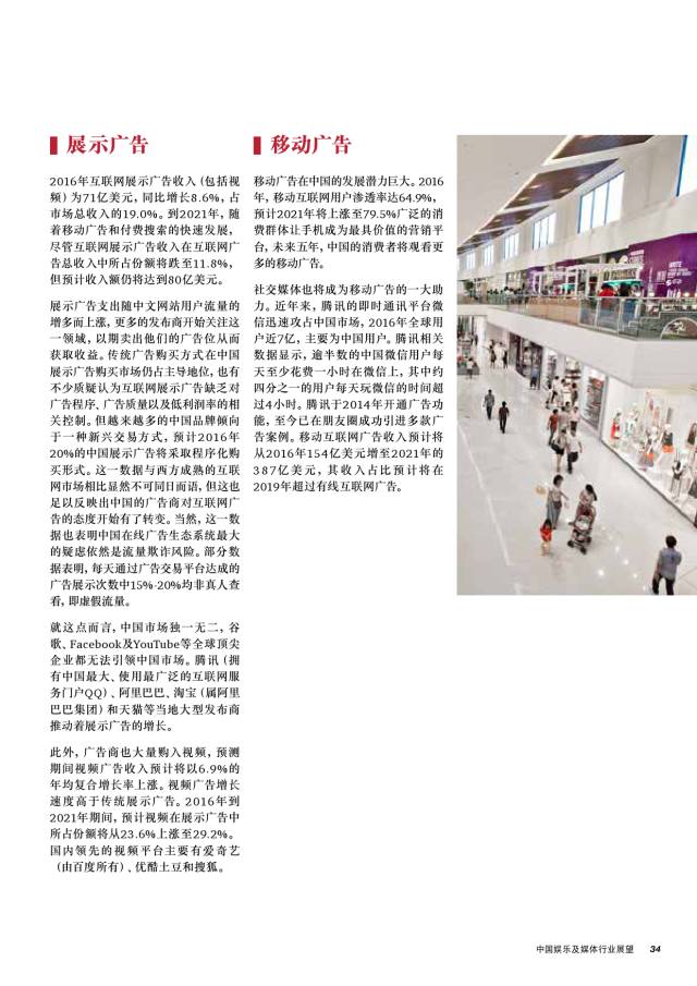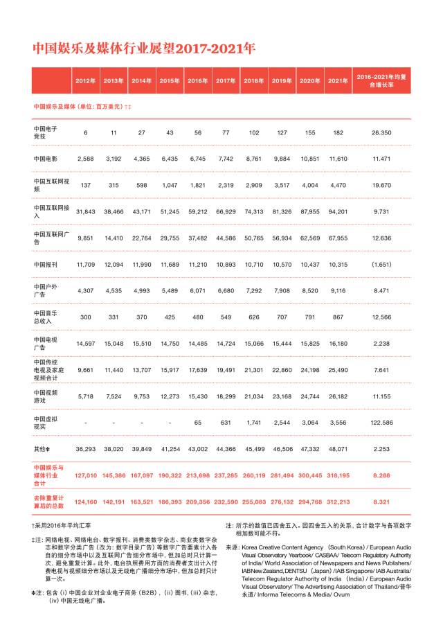 纵观中国娱乐及媒体市场,互联网视频、互联网广告、电子竞技、音乐、电影和视频游戏这几个领域的发展动力强劲,预计其2016-2021年的年均复合增长率分别为19.7%、12.6%、26.4%、12.6%、11.5%和11.2%。
