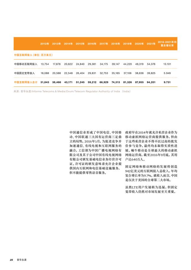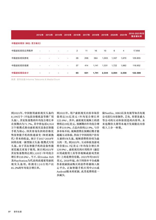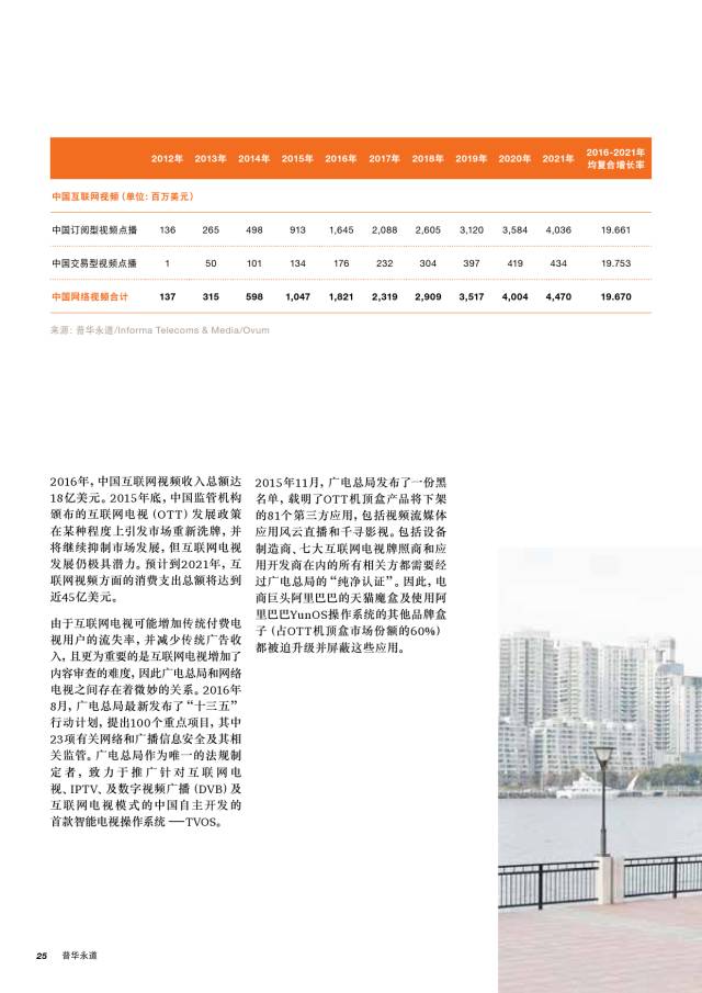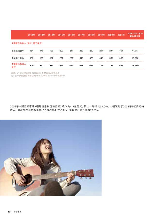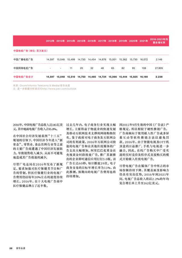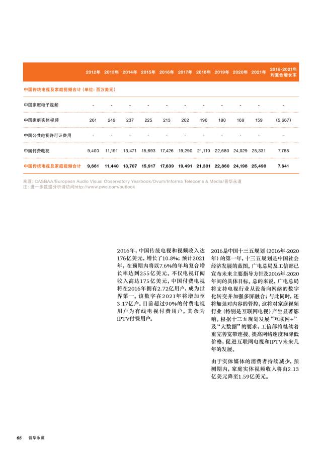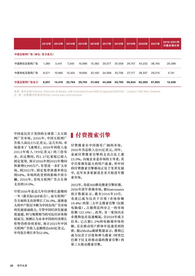 纵观中国娱乐及媒体市场,互联网视频、互联网广告、电子竞技、音乐、电影和视频游戏这几个领域的发展动力强劲,预计其2016-2021年的年均复合增长率分别为19.7%、12.6%、26.4%、12.6%、11.5%和11.2%。