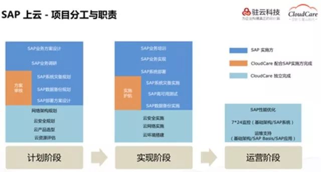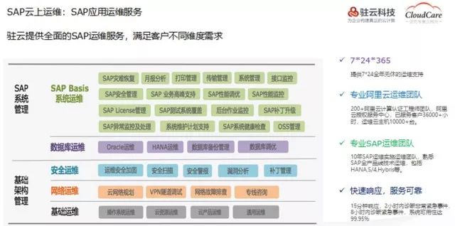当前IBM、埃森哲、汉得等SAP实施方在帮助客户实施新的SAP S/4HANA时,往往会推荐选择国内最成熟的IaaS平台阿里云。在实施方进场部署SAP之前,企业通常需要全面规划其在阿里云上的专有网络与线下数据中心的规划与对接。驻云发挥阿里云生态第一优势,基于阿里云最佳实践提供专业指导,提供了第一个CloudCare SAP上云交付钥匙服务包,帮助规划云上环境、部署云上资源、审核SAP实施方的部署方案,并协助测试云上SAP完整数据保护方案,为企业核心系统在云端的长期稳定持续运行保驾护航。