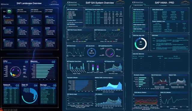在大会展区现场,由阿里云、驻云联合开发的SAP系统监控大屏重磅亮相,自此开启全球领先的SAP核心系统集中智能感知时代,吸引了众多专业大咖驻足观看。人潮涌动中可见三块蓝色大屏闪烁雀跃,12个企业关键应用包括SAP S/4 HANA、BW、PO、CRM、OA等指标实时监控,CPU、云网络等阿里云资源使用状况一目了然,单个S/4应用实例以及HANA数据库亦全都精确呈现。