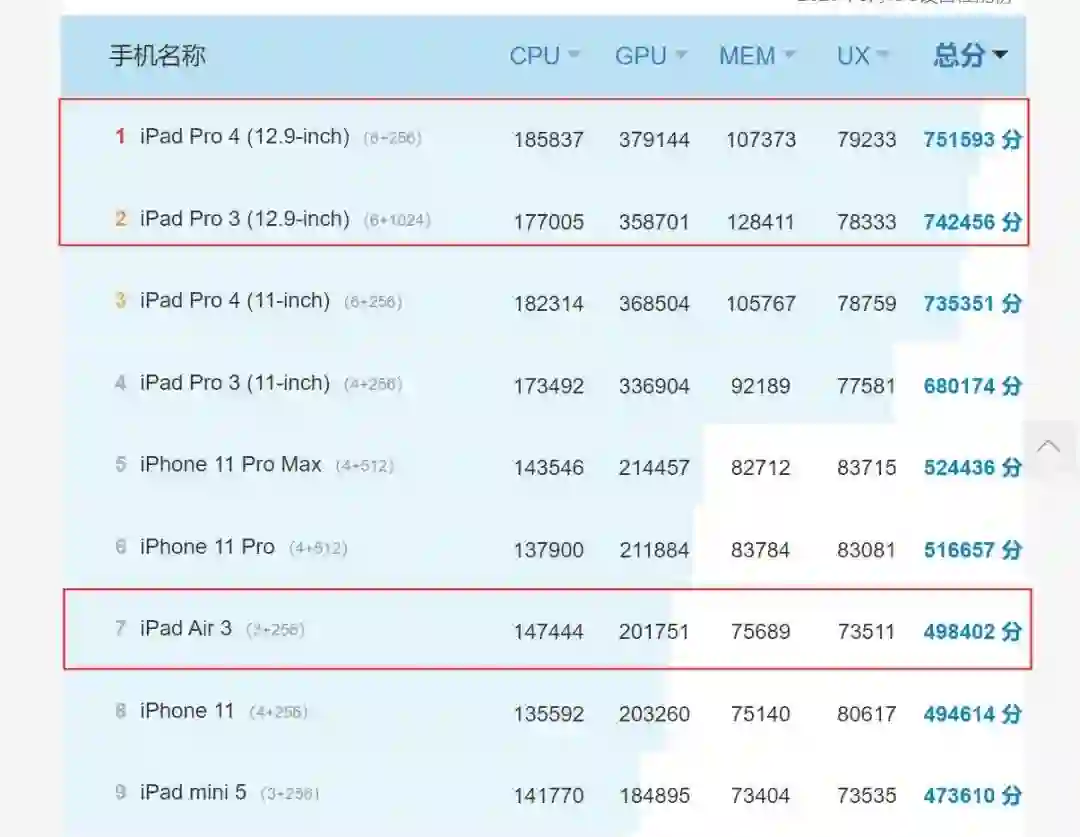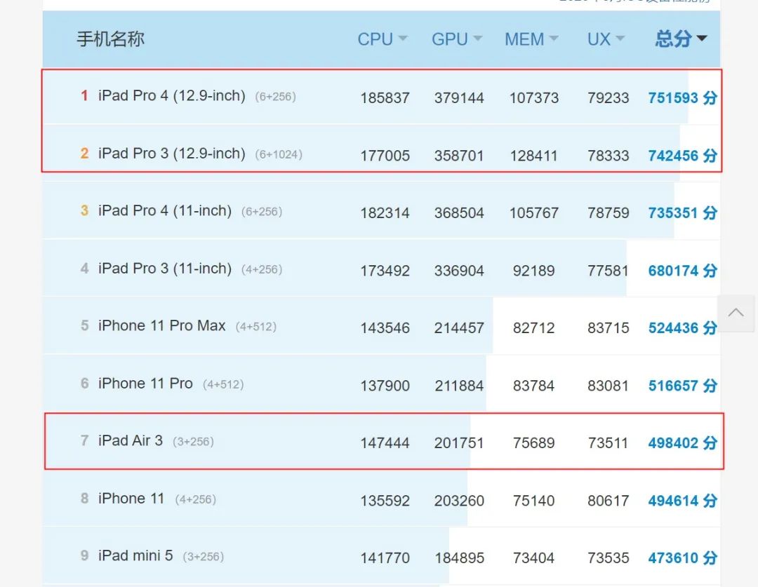 由于 iPad Air 4 仍未发布,因此我们暂时不能为这两台设备进行跑分对比。不过根据上述数据,我们可以粗略地进行对比。根据安兔兔官网的跑分数据,搭载 A12 处理器的 iPad Air 3 跑分数据如下: