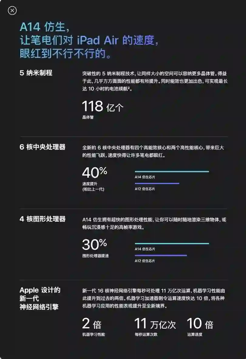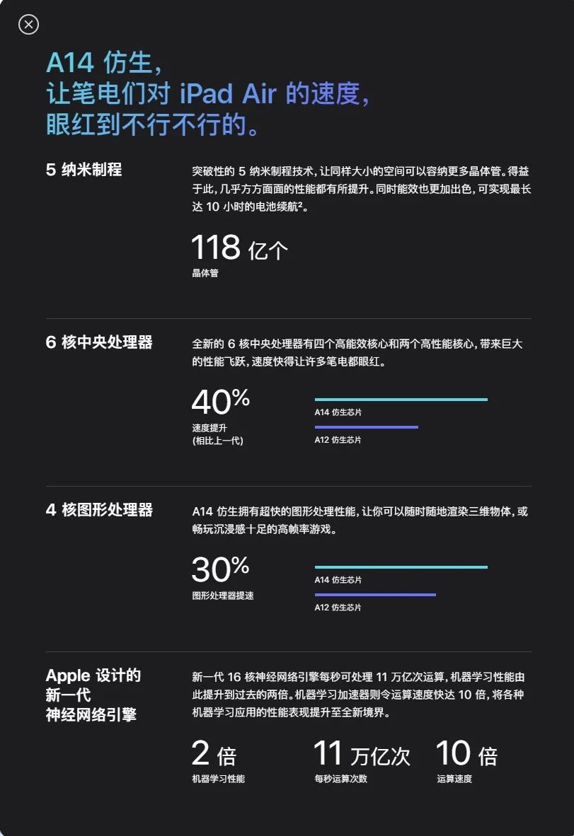 和往常在 iPhone 首发不同,苹果选择在 iPad Air 4 上配备全新 5nm 工艺的 A14 仿生芯片。据官网和发布会介绍,A14 搭载了六核 CPU 以及四核 GPU,性能相比前代 iPad Air 3 分别提升了 40% 和 30%。很多朋友会有疑问,A14 的芯片相比 A12Z 要强吗?
