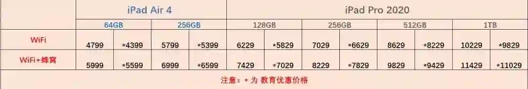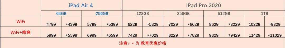 iPad Pro 2020 与 iPad Air 4 的价格如图所示。由于尺寸相近,因此只拿 11 英寸的 iPad Pro 与 iPad Air 4 的价格作对比。