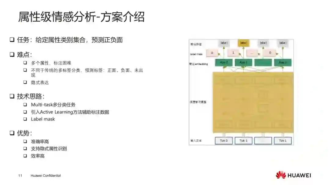 这里面的难点是,首先我们大框架使用的是有监督的方法,因为最终我们想要把应用部署到华为云的服务上,所以准确率要求是比较高的,要求达到90%以上,一般无监督的方法无法满足,所以还是需要有监督的方法。这就需要标注数据,如果是多个属性它的一个问题就是标注起来比较困难,比如说一个手机评论可能会涉及到二三十个属性或者说甚至上百种属性,如果要标数据的话,这会非常的困难。我们的方法不同于传统的多标签分类,像文本多标签分类任务的类别有政治、经济、新闻,该任务只涉及标签是否出现,但这里不一样的地方是它不仅涉及到属性是否出现,还要预测出属性的正负面,相当于每个属性都要预测出它的三个标签—正面、负面和未出现。相当于每个属性是一个多分类任务而不是一个二分类任务。之前那种多标签分类,一般最后会把每个标签转化成logits,这里的话用这种方法就没办法处理。然后还有就是隐式表达。