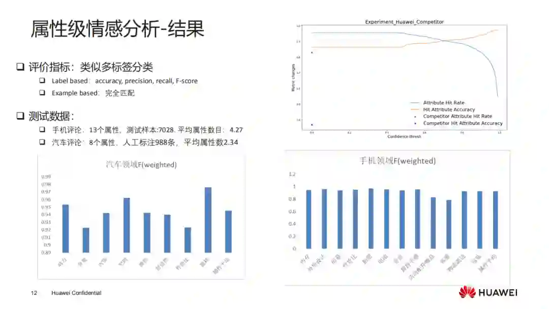 上面是我们最终的实验结果,针对汽车领域测试样本大概有7000多个,每个样本平均的属性数量是4.27个,其中预定义的属性集合是8个,最终可以看到每个属性的准确率都是很高的,基本上达到90%以上。针对手机领域的结果基本上也是每个属性F值基本上能达到将近90%。