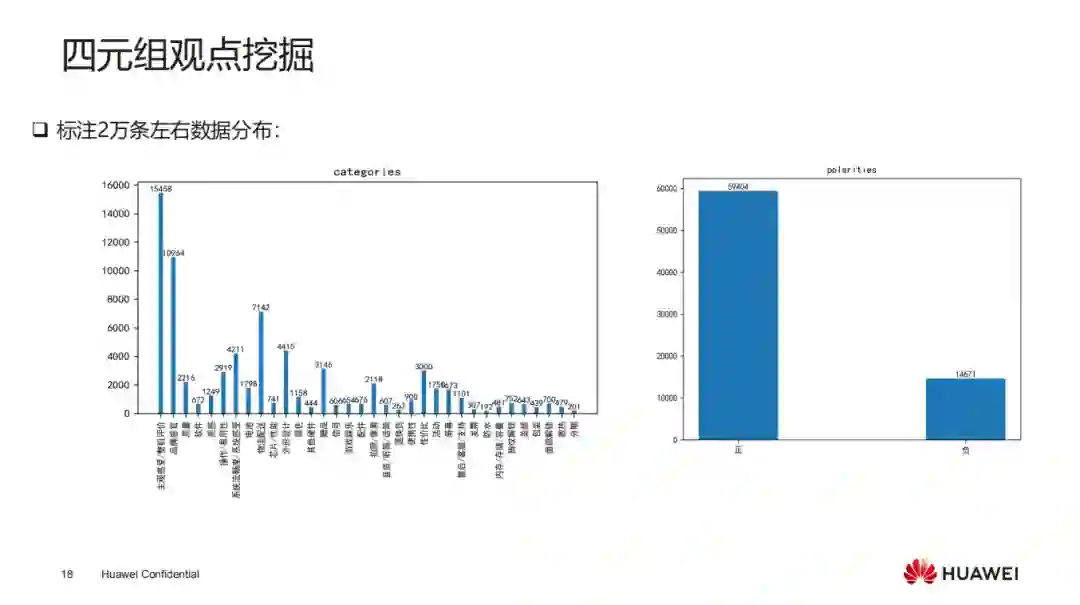 上图左边是我们标注大概两万条手机评论的数据分布,其实可以看到数据分布式非常不均衡的。这个是拿到真实用户在线上评论的数据,有些评论会偏的非常多,然而有些类别评论会非常少。上图右边是针对所有属性对应正负面的分布,这个也是非常不均衡的,正面的评论比较多,负面的评论会相对少很多。
