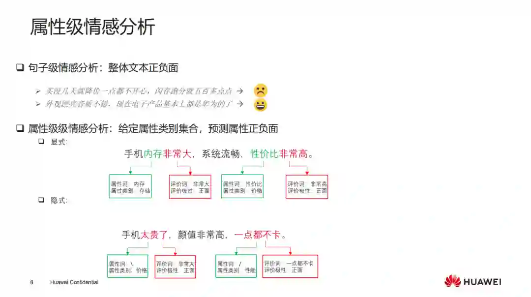 导读:随着移动互联网的普及,网络上每天产生大量的文本数据,蕴含着巨大的有价值信息。情感分析作为自然语言处理中的一个重要研究方向。在实践中有着广泛的应用,如商品评论分析、政治、金融、旅游等领域中的商品推荐、产品辅助决策、公司政府的舆情监测、服务评价等等。本文主要介绍情感分析的概念、应用、任务和方法,进一步会介绍华为云在细粒度情感分析方面的实践,包括属性级情感分析和观点四元组分析。