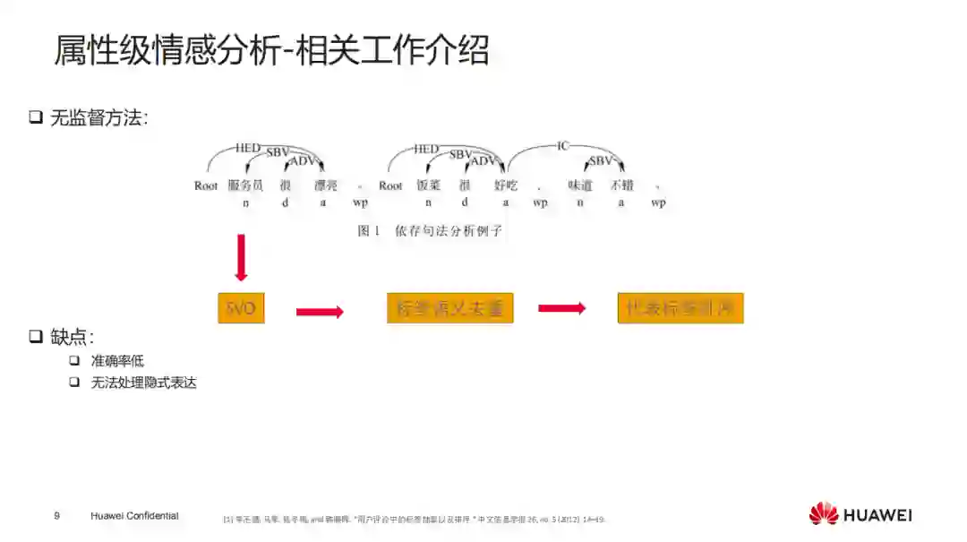 这种方法只能处理显示的表达,如果是隐式的表达,因为句子中没有属性词,那么通过句法解析没法得到对应的角色,所以无法分析来处理隐式的表达。这种无监督方法的优点是不需要标数据,缺点是准确率相对低一些,没法处理隐式表达。