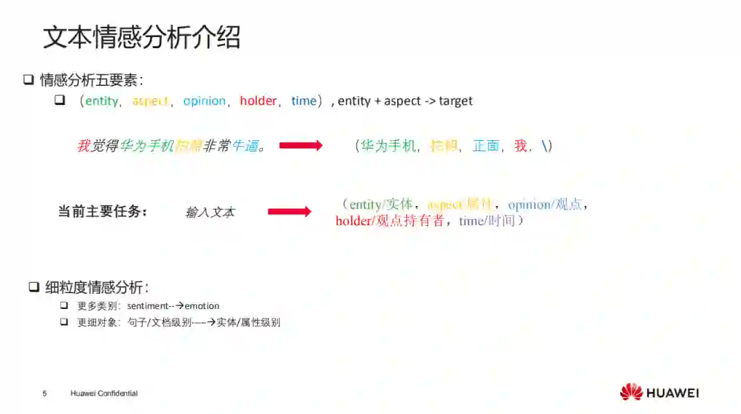 另一个概念一般会把entity和aspect合并在一起成为一个target,是针对我们目标对象的情感或者观点。例如:“我觉得华为手机的拍照非常牛逼”这里面对应的实体是“华为手机”,对应的aspect是“拍照”,对应的情感是“非常牛逼”为正面,对应的观点持有者是“我”,而时间没有提及所以为空。