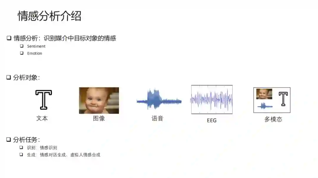 我们主要分析sentiment,从分析对象来看会包含文本、图像、语音,EEG(脑电波)、多模态分析情感。从任务方面来看,不仅是有情感的识别,还有情感生成的一些任务,像现在有情感对话的生成,还有虚拟人情感生成。在本报告中,主要侧重文本方面的情感识别。